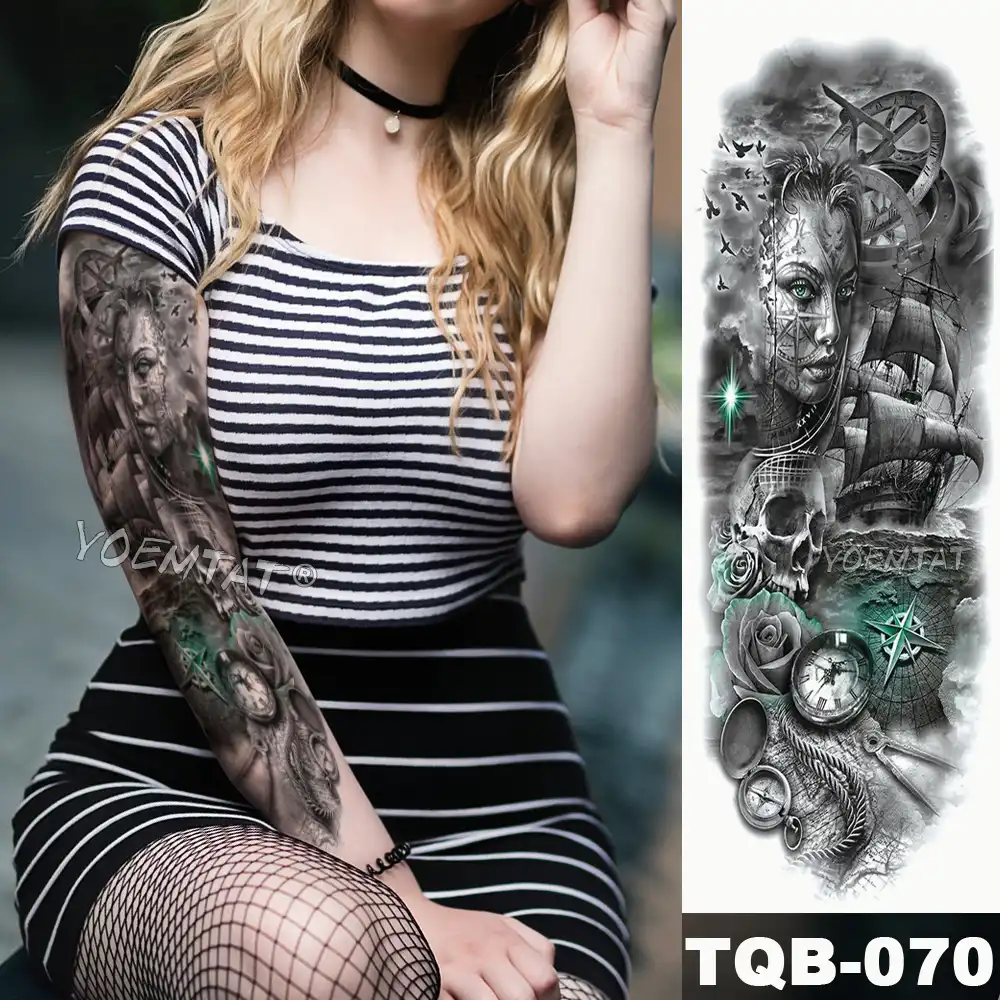 Manga De Tatuaje Para Brazo Grande Brujula Timon Tatuaje Temporal Impermeable Pegatina Barco Oceano Hombre Tatuaje Completo De Calavera De Pajaro Mujer Tatuajes Temporales Aliexpress